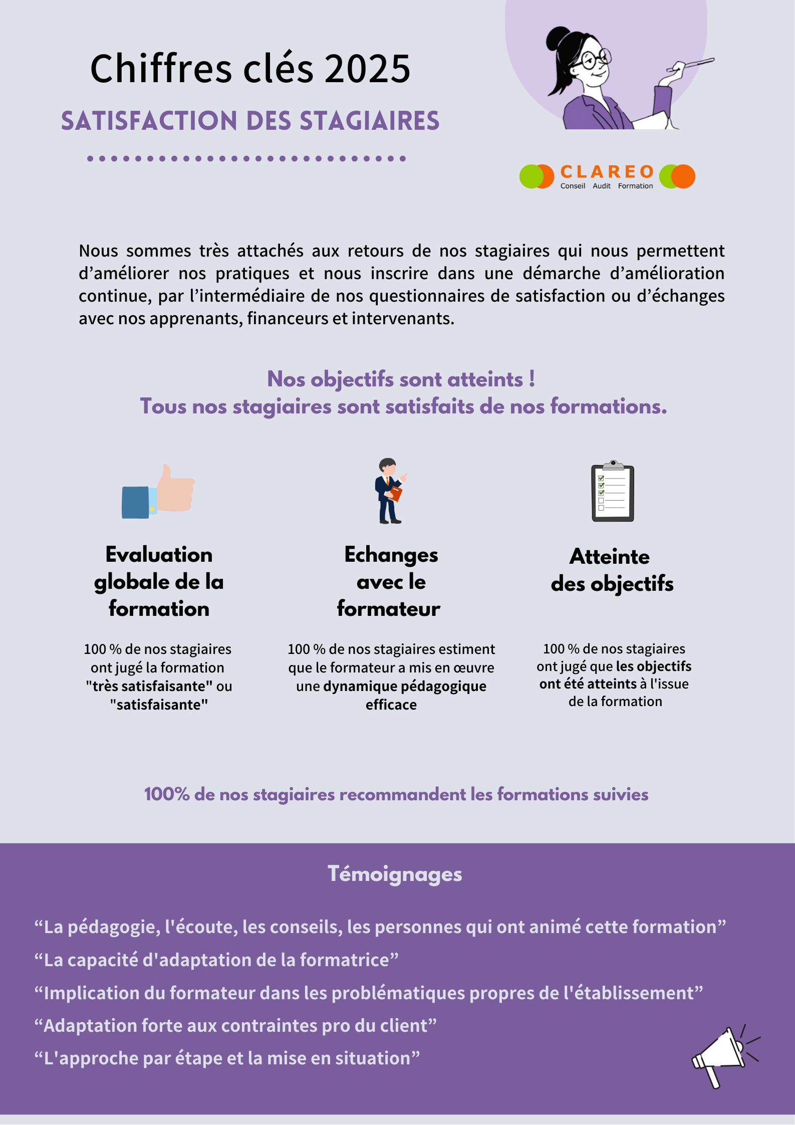 Résultats de la satisfaction des actions de formation % Evaluation globale formation % Echanges avec le formateur % Atteinte des objectifs